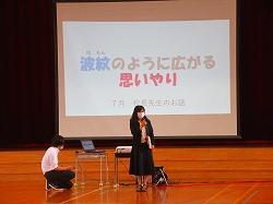 全校集会では、校長先生が「波紋のように広がる思いやり」をテーマに学校生活の中にあった、子どもたちの思いやりの行動を取り上げて紹介してくれました。