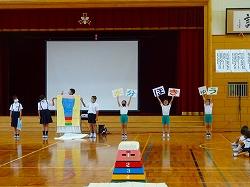 児童会タイムでは、4年生の学年発表と保健委員会の委員会発表がありました。
