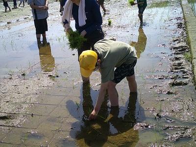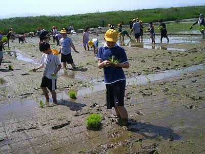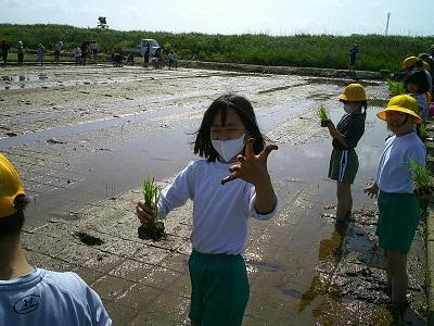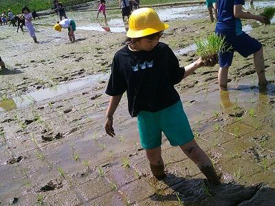 4.5.6年生で田植えをしました。田んぼの先生の髙道さんに教えていただき、みんなはだしで田んぼに入ります。「きゃーぬるぬるするー!」と言いながらも、苗を3本ずつていねいに植えました。大きく育ってくれるといいね。収穫が楽しみです。