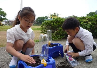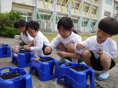 生活科「わたしのはなをそだてよう」の学習で、あさがおのたねをまきました。「大きくなってね。」と声をかけ、やさしく土をかけていました。これから毎日水やりをして大事に育ててほしいです。
