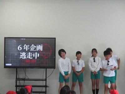 全校児童が参加して、6年生主催のイベント”逃走中”を行いました。6年生が、みんなが楽しめるように事前にしっかりと準備をしてくれていたおかげで、とても楽しいイベントとなりました。1~5年生は、6年生ふんするハンターに見つからないようにかくれたり、脱出カードを見つけ、友達を助けたりと、とても楽しそうでした。終わった後も「楽しかった」「またしたい」などの声があがっていました。6年生のみなさんありがとうございました。