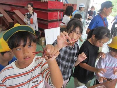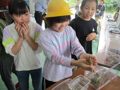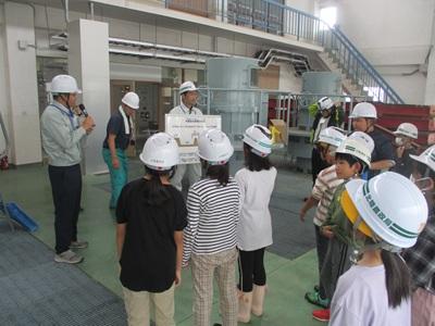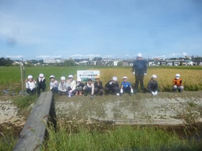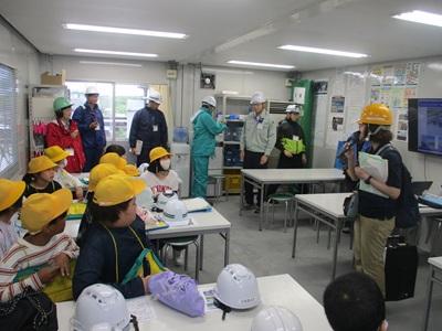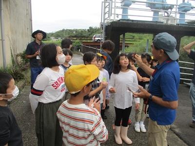 環境教育の一環として、河北潟放水路防潮水門の見学に行きました。現在新設工事中の防潮水門の様子を見て、子ども達はスケールの大きさに驚いていました。その後排水機場で水生生物を観察しました。生き物に触れながら、河北潟の環境について楽しく学ぶことができました。
