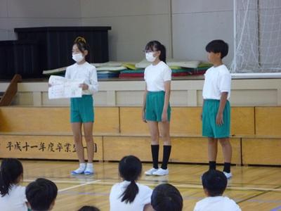 10月の全校集会の様子です。校長先生の話「協力」、学習目標「分かりやすく伝えよう」の話をしっかり聴くことができました。続いて企画委員会より生活目標「気持ちよいあいさつをしよう」のコツ㋐㋑㋒㋓㋔の発表がありました。素敵なあいさつがあふれる10月になるといいですね!