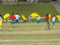 全校団競は、大玉転がし。ペアで協力して転がし、チームで大玉をつなぎました。