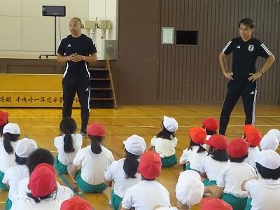 6/18(火)「スポーツを通じた子どもたちの心のケア」として、サッカー元日本代表の小村徳男さん、山田卓也さん、ツエーゲン金沢クラブキャプテンの廣井友信さんが来校され、全校児童と交流しました。サッカーだけでなく、様々なゲームも体験し、子ども達は体を動かすことや、協力することの楽しさを満喫することができました。本当にありがとうございました。