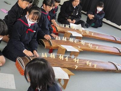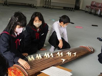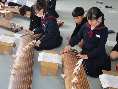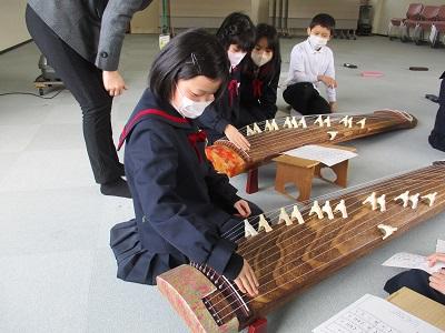 音楽「日本の音楽でつながろう」の学習で、琴の体験をしました。喜多先生に来ていただき、一人ひとり弾き方を教えていただきました。最初は難しそうにしていましたが、だんだん慣れて美しい音が出せるようになってきました。琴の美しい音色に癒されたいい時間になりました。