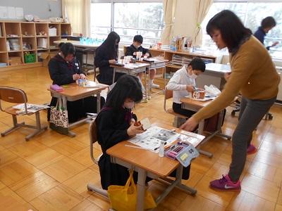 2月3日(火)の九谷絵付け体験の作品が完成しました。体験時は、細い筆での彩色が難しそうでしたが、自分のデザイン用紙と皿を並べてゆっくり丁寧に描いていました。仕上がった作品を見て子ども達は絵付けの時と焼いた後の色がずいぶんちがうことに驚いていました。作品を大切そうにながめ、仕上がりに満足そうな子ども達でした。