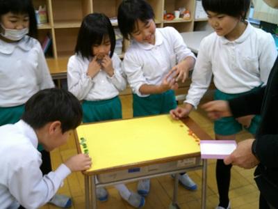 生活科「むかしからのあそびをたのしもう」の学習で、他学年と一緒にむかしからの遊びを楽しみました。けん玉対決、おはじき対決をして盛り上がりました。あそびを通して他学年との仲を深めることができました。
