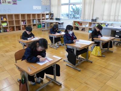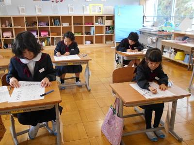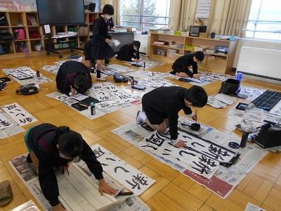 続いて行われた書初め大会では、手本を見ながら真剣に取り組んでいました。書き上げた作品は廊下に展示してありますので、ご都合のつく方はぜひ見に来てください。(展示期間:1/8.9 8:10~16:30)