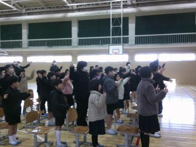 3月の全校集会は元気いっぱいの校歌で始まりました。その後、表彰伝達(①町スピーチフェスティバル、②調べる学習コンクール、③表現力の達人)を行い、続いて校長先生の話「どれだけ成長したかな」、学習目標の話「次の学年につなげよう」を聴きました。児童会タイムでは、健康委員会より「元気に過ごすコツ」の発表とエクササイズ「エビカニクス」の紹介がありました。皆で楽しく体を動かし、体も心もポカポカになりました。