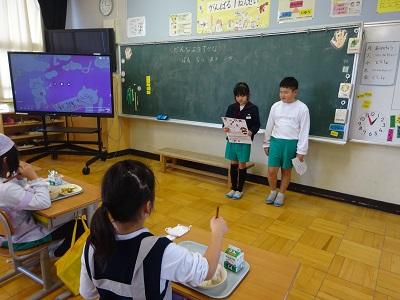 3月の全校集会は元気いっぱいの校歌で始まりました。その後、表彰伝達(①町スピーチフェスティバル、②調べる学習コンクール、③表現力の達人)を行い、続いて校長先生の話「どれだけ成長したかな」、学習目標の話「次の学年につなげよう」を聴きました。児童会タイムでは、健康委員会より「元気に過ごすコツ」の発表とエクササイズ「エビカニクス」の紹介がありました。皆で楽しく体を動かし、体も心もポカポカになりました。