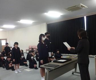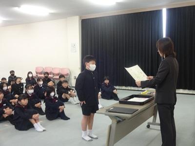 3月24日(火)修了式を行いました。にしっこチャレンジと読書賞の表彰の後、校長先生の話、春休みの生活の話を聴きました。1年間のしめくくりにふさわしい、立派な態度でした。春休みも元気に過ごし、進級に備えてほしいと思います。