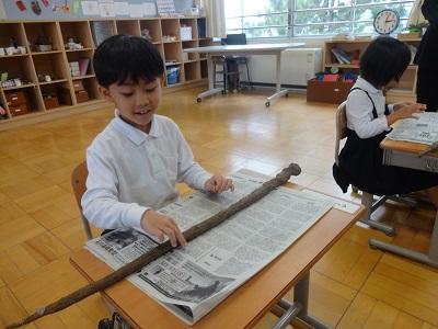 道徳「わたしのまちのたからもの」の学習で、七尾の沢野地区でしかとれない「沢野ごぼう」を育てている平田さんから、お話を聞きました。普通のごぼうとは違う「たからもの」の沢野ごぼうにとても興味をもっていました。
