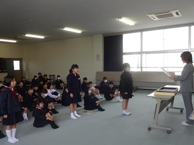 3月の全校集会は元気いっぱいの校歌で始まりました。その後、表彰伝達(①町スピーチフェスティバル、②調べる学習コンクール、③表現力の達人)を行い、続いて校長先生の話「どれだけ成長したかな」、学習目標の話「次の学年につなげよう」を聴きました。児童会タイムでは、健康委員会より「元気に過ごすコツ」の発表とエクササイズ「エビカニクス」の紹介がありました。皆で楽しく体を動かし、体も心もポカポカになりました。