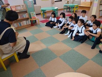 ナディに乗って内灘町立図書館、総合公園へたんけんに行きました。図書館では本を読んでもらい、好きな本を選んで借りました。公園では、遊具で遊んだり秋みつけをしたりしました。