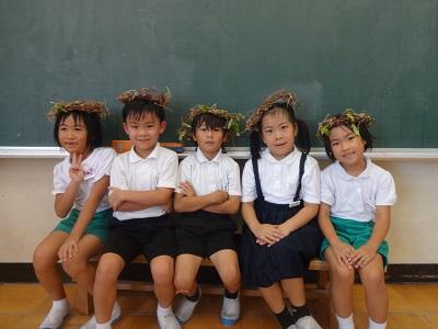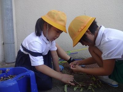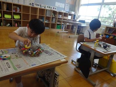 あさがおのつるを使ってリースを作りました。友だちと協力してリースにして、出来上がるとかんむりにして嬉しそうにかぶっていました。リースにリボンやボタンなどのかざりをつけてオリジナルリースができました。