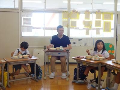 2学期からALTのリリィー先生に代わり、ジャスティン先生とお勉強をします。今回は自己紹介をしました。ジャスティン先生から手描きのかわいい名刺をもらって嬉しそうでした。授業のあと、ジャスティン先生と一緒に給食も食べました。