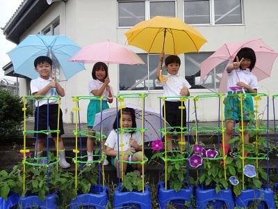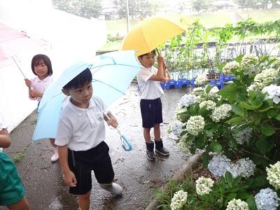 生活科「あめのひのふしぎ」の学習で、校庭に出て雨の日さんぽをしました。かさや地面に当たる雨の音を感じたり、葉や鉄棒に雨粒がついている様子を観察したり、晴れの日とは違う雰囲気を楽しんでいました。