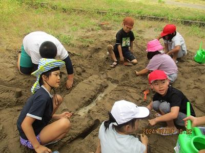 図工「すなやつちとなかよし」の学習で、どろんこ遊びをしました。みんなでなかよく川やトンネルを作ったり、水を流したりして、おもいっきり遊びました。また、プリンカップなどを使ってお料理もして、想像を働かせて楽しんでいました。