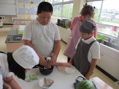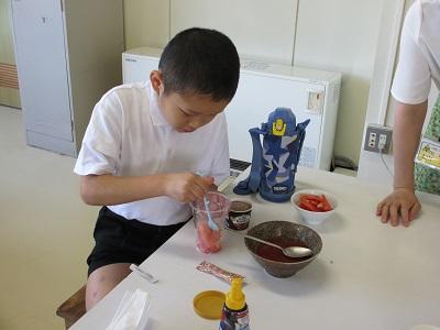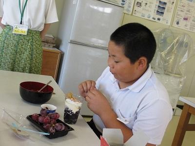 2日(火)に、町の交流会で近江町市場へ行ってきました。交流会3年目の3人は、電車とバスの乗車、お店での買い物は慣れたもので、スムーズに活動していました。買って来た物で何を作るか相談したところ、パフェに決まりました。2日にはフルーツゼリーを作り、3日にはおのおのが2日に作ったゼリーやアイス、買ってきた果物を使って、オリジナルパフェを作りました。どのパフェもとても美味しそうでした。みんなでおいしくいただきました。