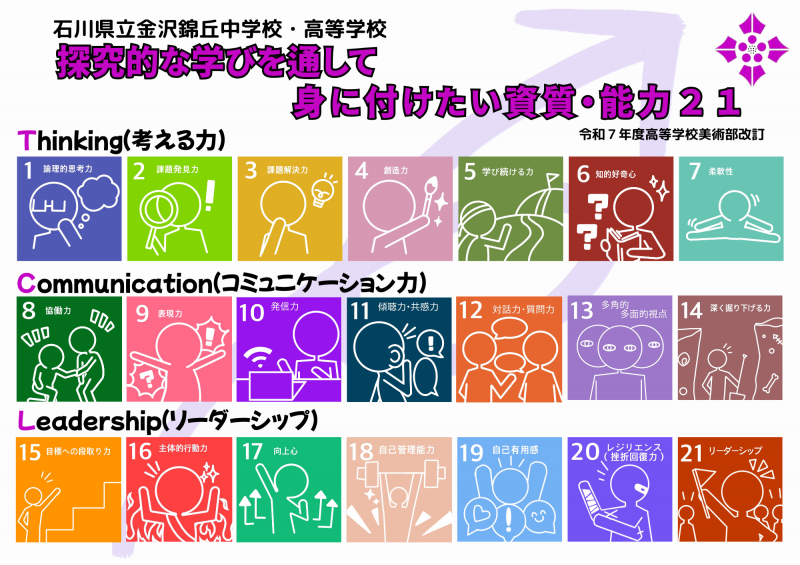 令和5年度に、錦丘中学校・高等学校は「総合的な学習及び探究の時間を通して身に付けたい21の資質・能力」を設定しました。下のピクトグラムは、令和5年度の高等学校美術部が作成し、令和7年度に改訂したものです。