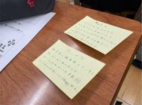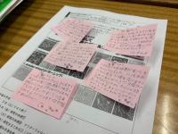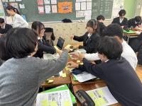 生徒たちは班ごとに付箋を交換し合い、日頃の感謝の気持ちや、互いが身につけてきた資質・能力を言葉にして伝えました。