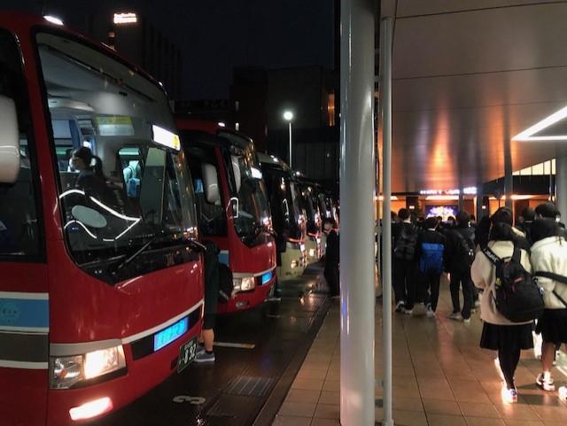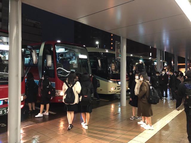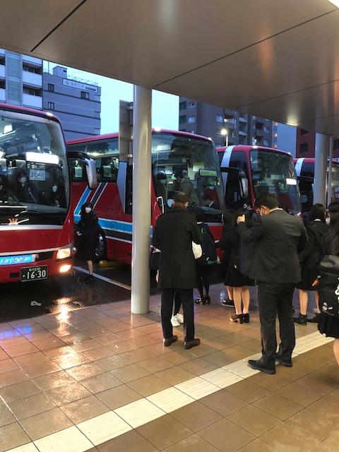 1日目の出発の様子です。あいにく冷たい雨の中での出発になりました。道中が密にならないように、1クラスが大型バス2台ずつを使用して、一路、伊丹空港・神戸空港を目指します。(いってらっしゃーい!)