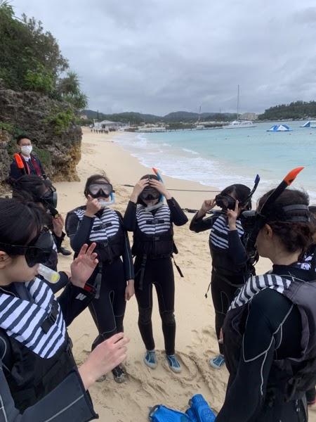 生徒の希望に合わせて、マリン体験、文化体験に分かれて活動を行いました。シュノーケリングの体験やビーチでの様々なアクティビティなど、それぞれが非常に楽しんでいる様子が見られました。シュノーケリングでは、海の底まで見える透明度の高い海に大興奮し、たくさんの魚が見えたことや餌付けができたことなどを教えてくれました。文化体験では、キャンドルづくりとシーサーの絵付けを楽しみました。個性豊かな絵付けで、中には非常にユニークでカラフルなシーサーをイメージしている生徒もいました。いいお土産になりましたね。