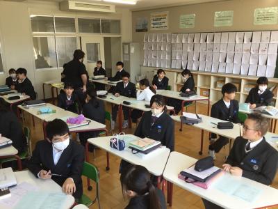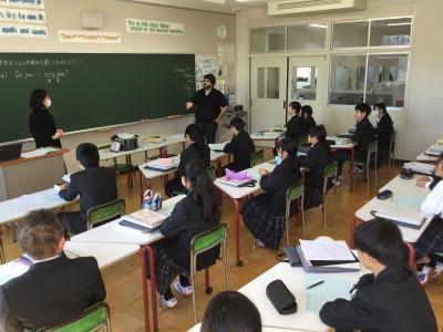 2026年1月13日 01時30分 1年生の英語の授業では、担当の先生とALTのジョシュア先生が、冬休みの出来事について「やりとり」をしていました。生徒達のお手本として10分ほどのやりとりです。生徒たちは、これまでの学習を生かして、しっかり聞き取ろうと耳を傾け、時折、話の内容に思わず反応する様子も見られました、終始明るい雰囲気でした。