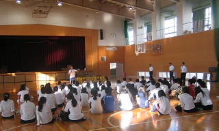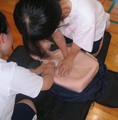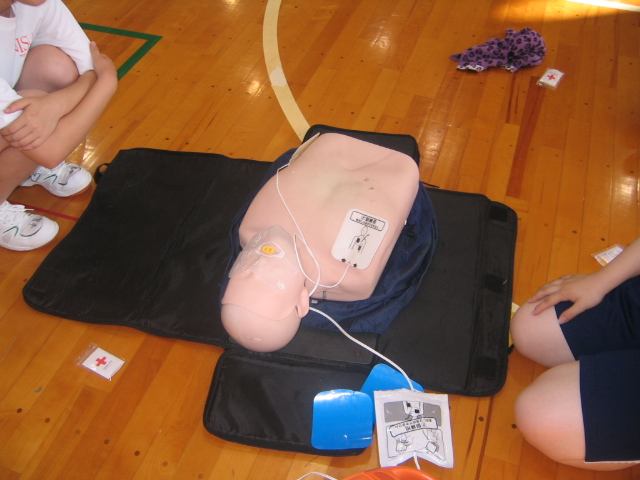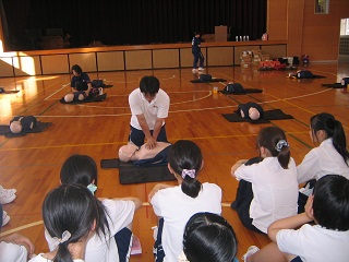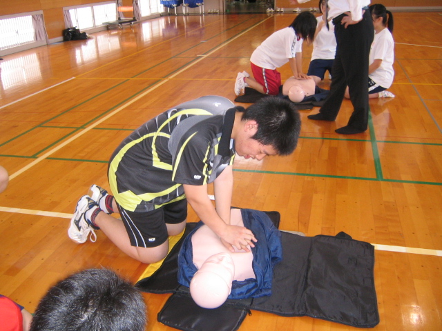 7月11日(木)放課後、講堂において、日赤救急法指導員の指導のもと、心肺蘇生法・熱中症について講義と実技を学びました。