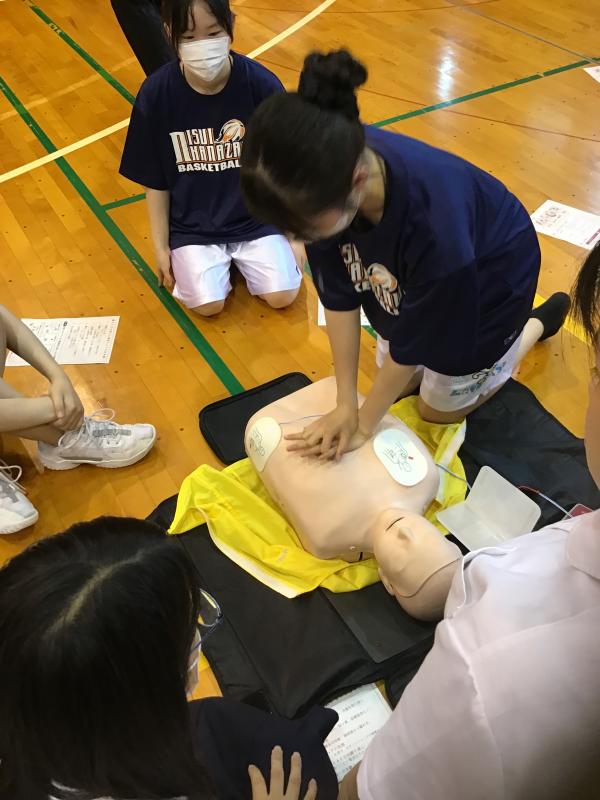 日本赤十字社石川県支部から3名の方に来ていただき、各部の代表者に集まってもらい、生徒救命講習会を実施しました。