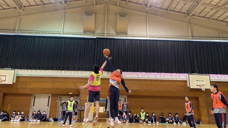 種目は卓球、バレーボール、バスケットボール、バドミントンの4種目で、生徒は各自1種目に参加しました。体育の授業では出場する種目を選び、この日に向けて技術力・チームワークを高めてきました。昨年度はコロナ禍のため試合の様子はオンラインで配信という形でしたが、今年は感染対策を行いながらもコロナ禍前のように1年生全員が体育館・講堂に集まり応援することができました。会場は活気に満ちあふれ、大きな声援が送られていました。
