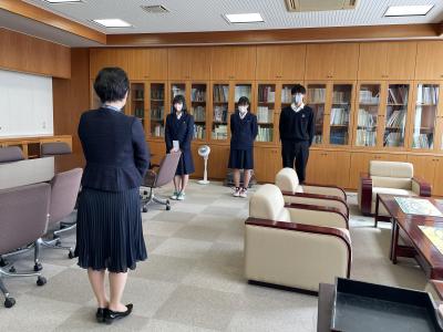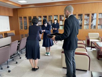 本校同窓会より、和田七海さん、角田菜七子さん、白田爽さんが学校の名誉を高めたとして、西野十治同窓会会長より、からたち賞を授与されました。