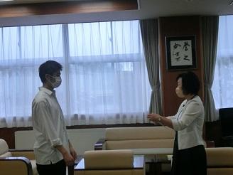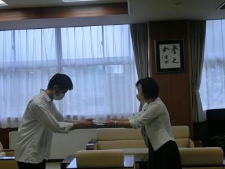 校長から合唱部部長・成田咲太郎(3年)に激励費が手渡されました。