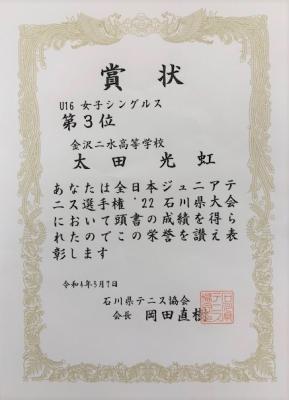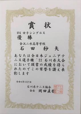 2022年5月26日 14時55分「全日本ジュニアテニス選手権’22石川県大会」において、本校の石田紗矢さんがU16女子シングルスで優勝・ダブルスでも優勝、太田光虹さんはU16女子シングルスで第3位・ダブルスで準優勝を勝ち取りました!