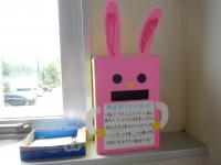 2021年5月21日 14時35分昼食時、コロナウィルス感染症予防から、生徒は各自、自分の机で黙食です。そこで楽しみになるのが、放送部によるお昼の放送です。放送室の前には、ピンクのウサギのリクエスト箱が置かれています。今日は女の子が二人、リクエストを書いていました。