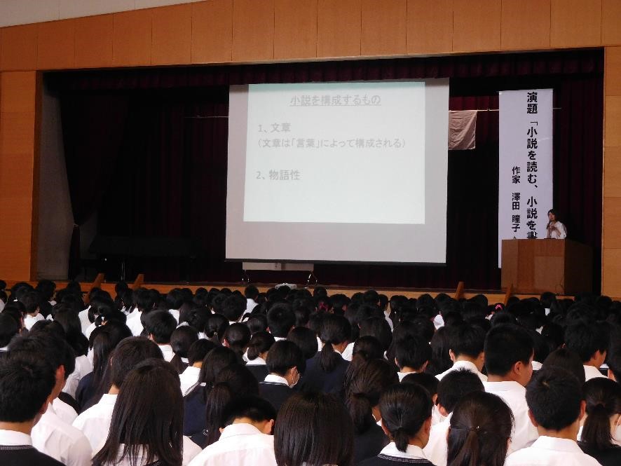 5月24日(金)「2019高校生のための文化講演会」が行われ、作家の澤田瞳子先生が「小説を読む、小説を書く」という演題でお話をされました。生徒たちは熱心にメモをとりなが講演を聞いていました。お話のあと生徒から、「本と携帯電話の媒体によって読むことの違いはありますか。」「小説を読む場合、他の作家さんの本を読んだ人生と自分で考えて作り出した人生では違いがありますか」などの質問が出ていました。