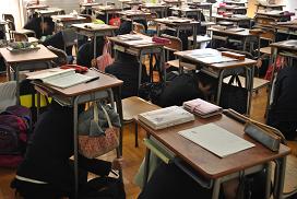 4月19日(金)の朝礼の時間に、強い地震があったという想定で防災訓練を実施しました。地震が起きたときに、生徒・職員が素早く身の安全を確保し、現員数を確認して迅速な避難行動ができるよう、緊張感を持って訓練を行いました。