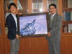 2012年8月7日 16時16分 この度、本校第51期生で画家の西野健太郎様より、作品の御寄贈を賜ることになり、8月7日(火)9時30分より校長室で贈呈式が行われました。寄贈作品は「天空の音」 で、オオカミ親子の愛情が伝わってくる絵です。「生徒の心の癒しに役立ててほしい」と御寄贈いただきました。本校管理棟2階の生徒課室前の壁面に飾る予定です。貴重な作品の御寄贈、本当にありがとうございました。