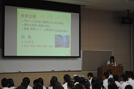 視聴覚教室での生徒による学校概要説明の様子
