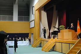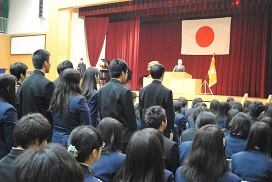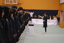 2015年3月5日 08時17分 3月4日(水)午前10時より、本校第67回卒業証書授与式を挙行しました。国歌・校歌斉唱に続き、卒業証書授与では卒業生一人一人が呼名に元気よく返事をし、304H小原優吉君が総代として卒業証書を受け取りました。さらに学校長式辞では「コミュニケーション力や情報処理力をさらに磨き、主体的に判断、行動する能力を養ってほしい」と述べ、最後に吉田松陰先生の「夢なき者に理想なし、理想なき者に計画なし、計画なき者に実行なし、実行なき者に成功なし。故に、夢なき者に成功なし。」という言葉を卒業生に贈りました。その後、教育委員会告辞、PTA会長の片岡さんによる来賓祝辞、生徒会長の福井瑞穂さん(202H)による在校生送辞、辻日向子さん(308H)による卒業式答辞のあと、卒業式の歌(仰げば尊し・蛍の光)を斉唱しました。