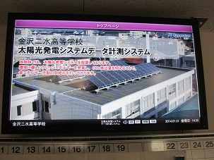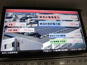 また、この際の電力量やその累計を表示するモニターが、職員室前廊下の壁面に取り付けられ、常時モニタリングすることができます。