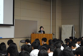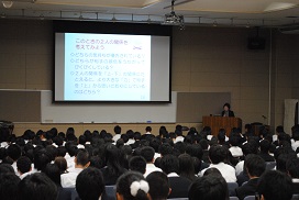 講話では、自分と相手との上下関係・支配するされるの関係がDVを起こす背景となることや、対等な関係を築くためには「男らしさ」や「女らしさ」にとらわれずに「人間らしさ」を大切にすることが大切で、それによってDVは無くなっていく、というお話を聞きました。また、「デートDV」の具体例をわかりやすく説明したDVDを視聴しました。
