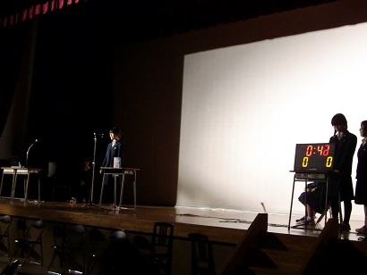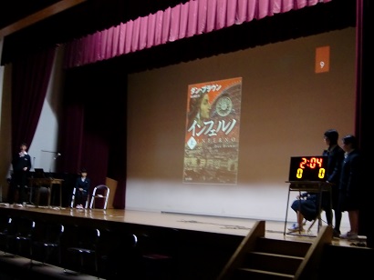 (左)図書委員会:ビブリオバトル頂上決戦を制した2年生。大変よく練られていたスピーチに感心しきりの観衆。