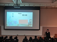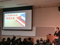 今回の1年生大会は、年末のクラス内大会で決定した代表生徒10名によるバトルです。代表者は、クラス内大会時の構成を練り直し、1年生全員を前にして自分の選んだ本の面白さを生き生きと、わかりやすく、そして熱のこもった発表をしてくれました。