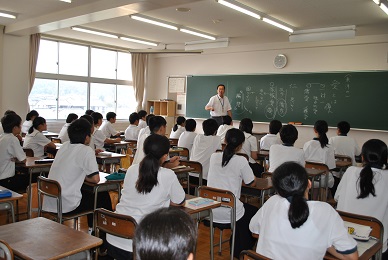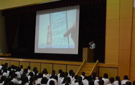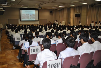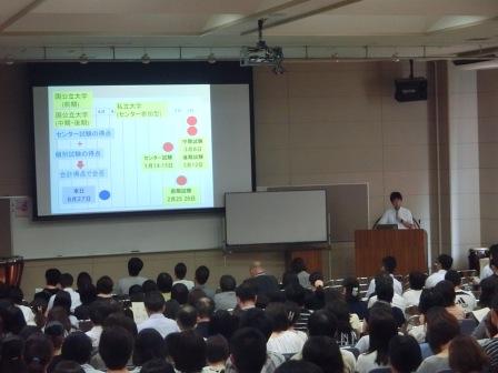 学年主任からのあいさつの後、進路指導課長より、来年度の大学入試センター試験の日程や出願手続きなどに関する説明が行われ、9月のセンター試験出願から1月末の国公立大学出願までの日程と、保護者として留意すべき点について、理解を深めていただきました。