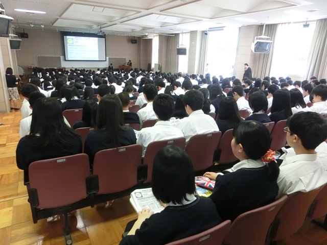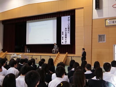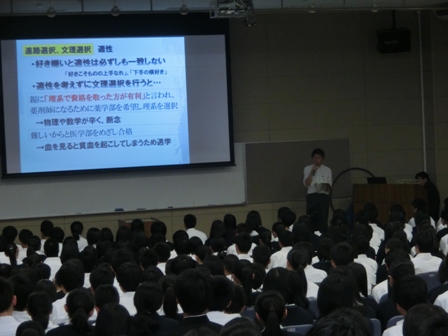 「総合的な学習の時間」では、1学期に大学や、学部・学科について調べ学習をしています。2学期には、一人一人、文系へ進むか、理系へ進むか、選択しなければなりません。前向きな選択ができるように、今日の話を生かしてほしいと思います。