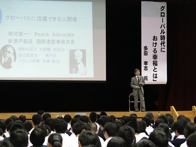本日5月19日(木)、本校講堂において「生き方セミナー」を開催しました。「グローバル時代における幸福とは」と題して多田孝志先生にご講演いただきました。