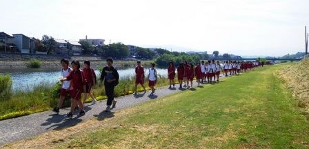 (犀川河畔、さわやかな風が吹き抜ける中を軽やかな足取り)