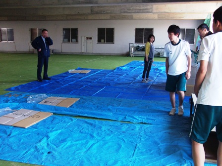 (雨天練習場に分別ゴミ用のブルーシートを準備します)